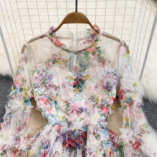 Spring and Autumn Fairy Mesh Floral Dress Round Neck Long Sleeve A Line Dress 1297