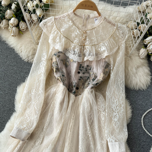 Spring and Autumn Retro Lace Dress Mid Length Fairy Lace Dress 1172