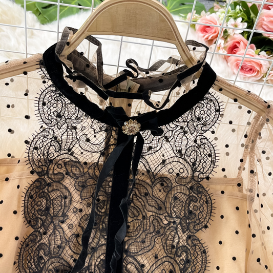 Autumn Bowknot Stand Collar Polka Dot Lace A Line Dress 1369