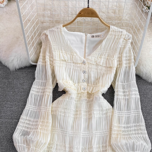 Vintage Long Sleeves V Neck Ruffled Short A Line Chiffon Dress 1628