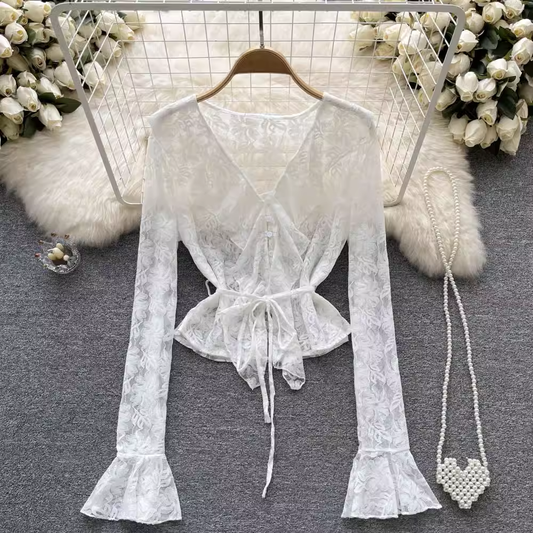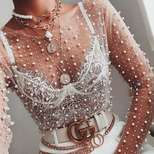 Fairy Sexy See Through Lace Shirt Beaded Mesh Long Sleeves Top 1541