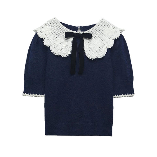 Summer Navy Sweet Bow Short Sleeves Round Neck Sweater Top 1484