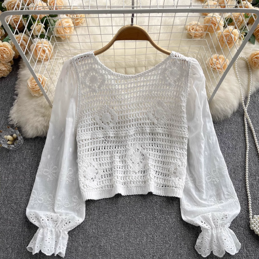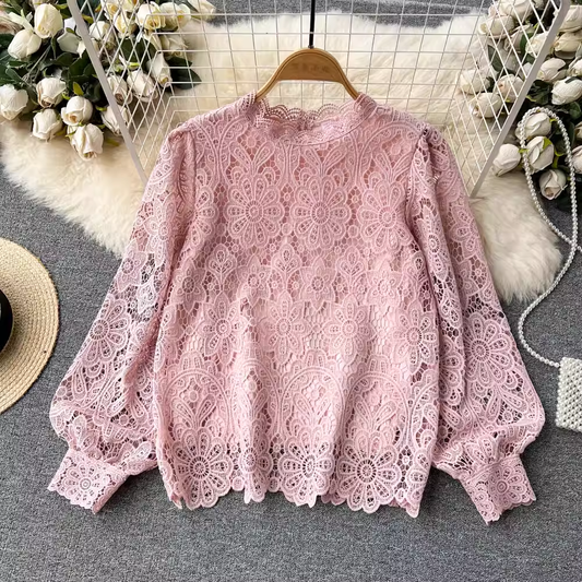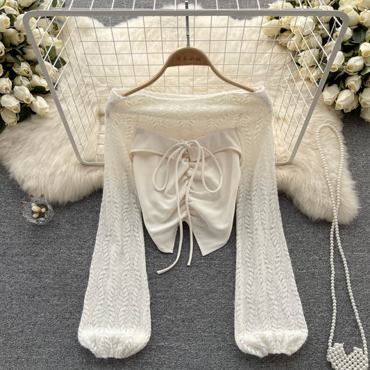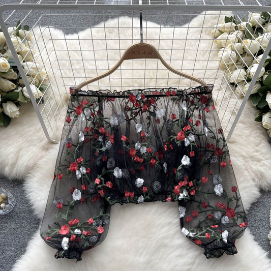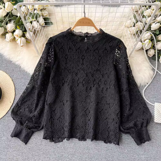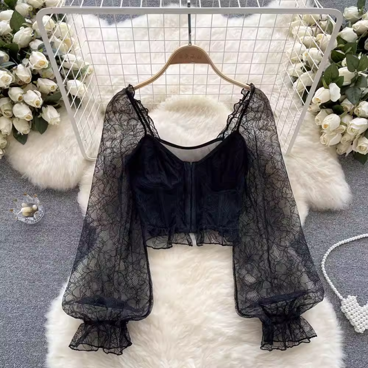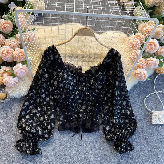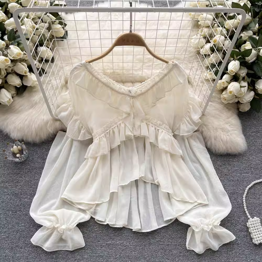 French See-through Mesh Lace Ruffled Puff Sleeve Chiffon Shirt 1868