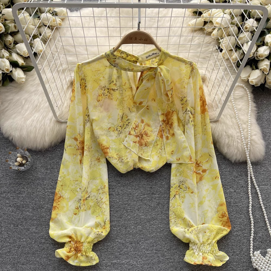 Chiffon Long-sleeved Shirt for Women Sweet V-neck Short Floral Top 1869
