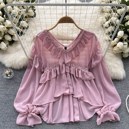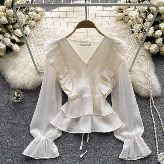 French Style Long Sleeved V Neck Ruffled Chiffon Shirt Casual Top 1368