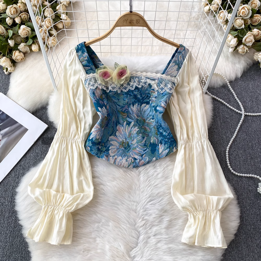 Spring and Autumn Retro Long Sleeve Square Collar Printed Shirt Women's Casual Top 1402