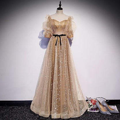 Elegant Gold Evening Formal Dress Mid Sleeves Sparkly Long Prom Dress 204