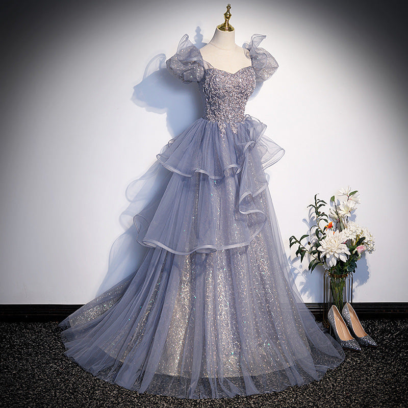 Fluffy Gray Blue Party Ball Gown Sweet 16 Formal Prom Gown with Puff Sleeves 716
