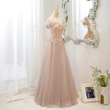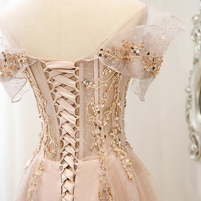 Off Shoulder Pink Tulle Prom Dress Sequins Long Evening Formal Party Dress 189