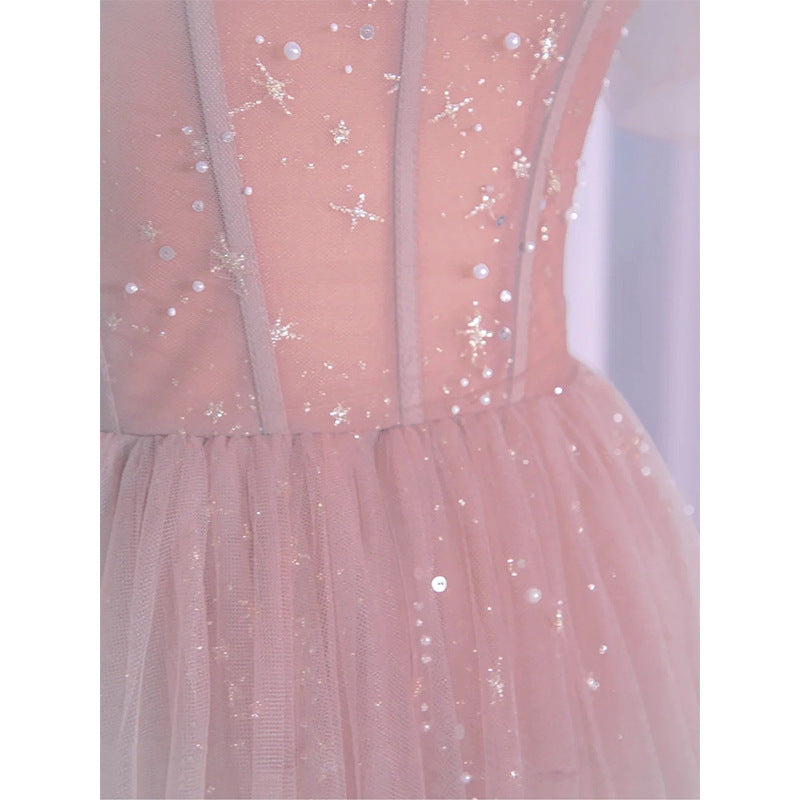 Pink Tulle Fairy Long Prom Dress Shiny Sweet Evening Gown 581