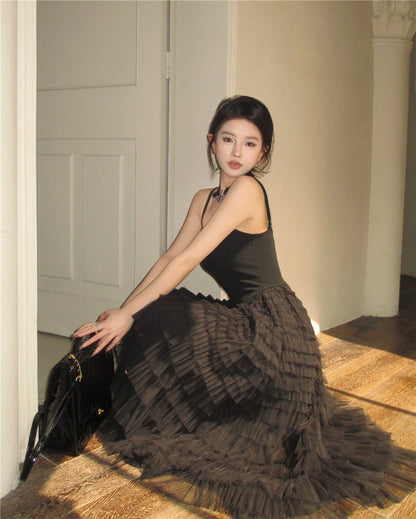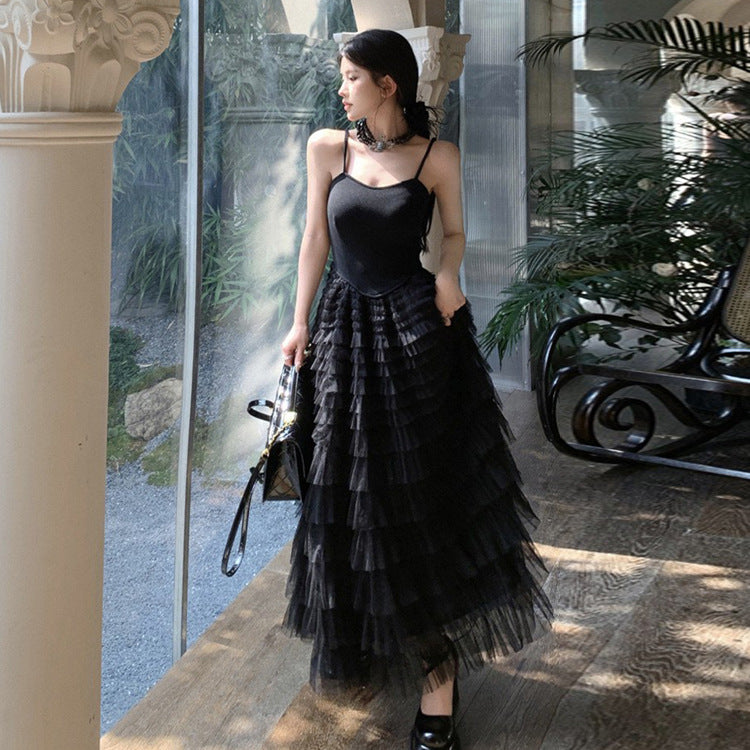 Retro Black Spaghetti Strap Dress Mesh Layered Long Dress 1089